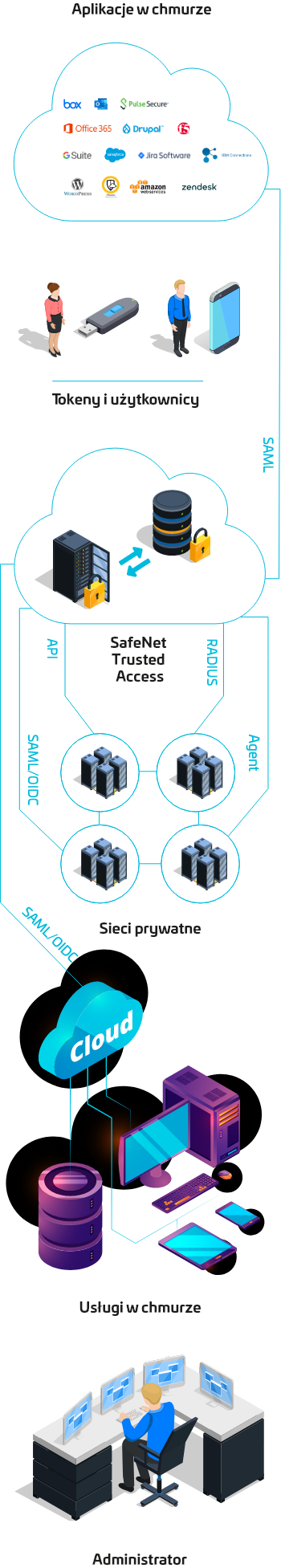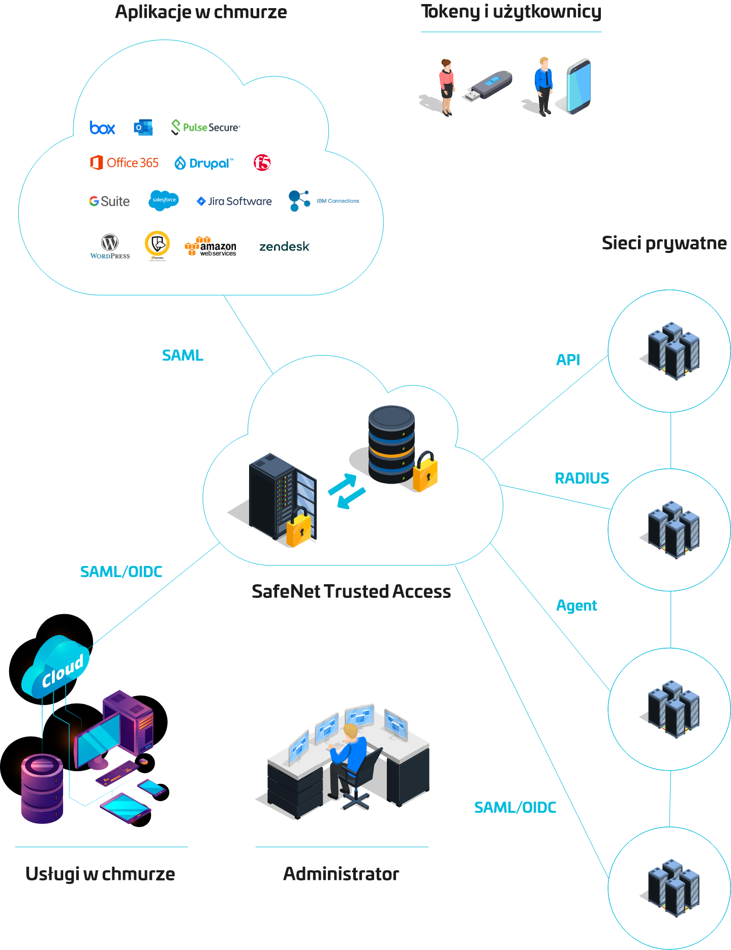 SafeNet Trusted Access wykorzystuje standardowe protokoły w branży – RADIUS, SAML i ostatnio popularny OIDC. Oznacza to, że może zostać zintegrowany praktycznie z dowolną aplikacją i urządzeniem dostępowym, w tym z urządzeniami wiodących producentów. Aplikacje i urządzenia, które nie wspierają standardowych protokołów, można chronić poprzez zainstalowanie agenta SafeNet Trusted Access oraz dostępność API. Agent zapewnia również ochronę komputerom pracującym pod Microsoft Windows, domenom, zdalnym desktopom i użytkownikom terminali.